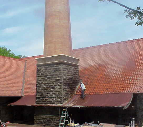 Jamison completed the south wall at the front of the campus, rebuilding some areas and then repointing it 100%. A “Mast Climber” was also brought in to access the 104 foot tall circular structure, in order to repoint the brick smoke stack. Support bands requested by the University were installed to create added stability.